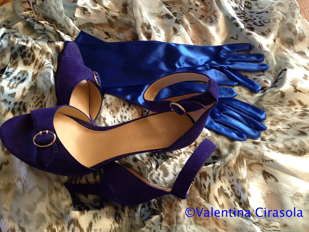 Accessories will be simple: a necklace with two large pendants on a long blue cord, cobalt blue silk long gloves, pochette, and suede shoes. What do you think?