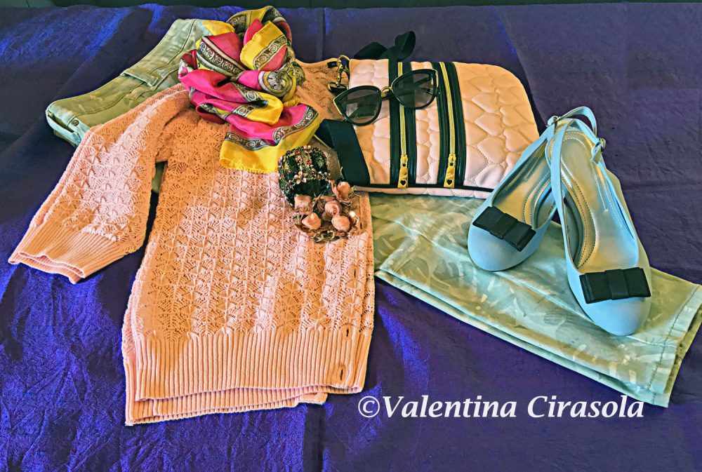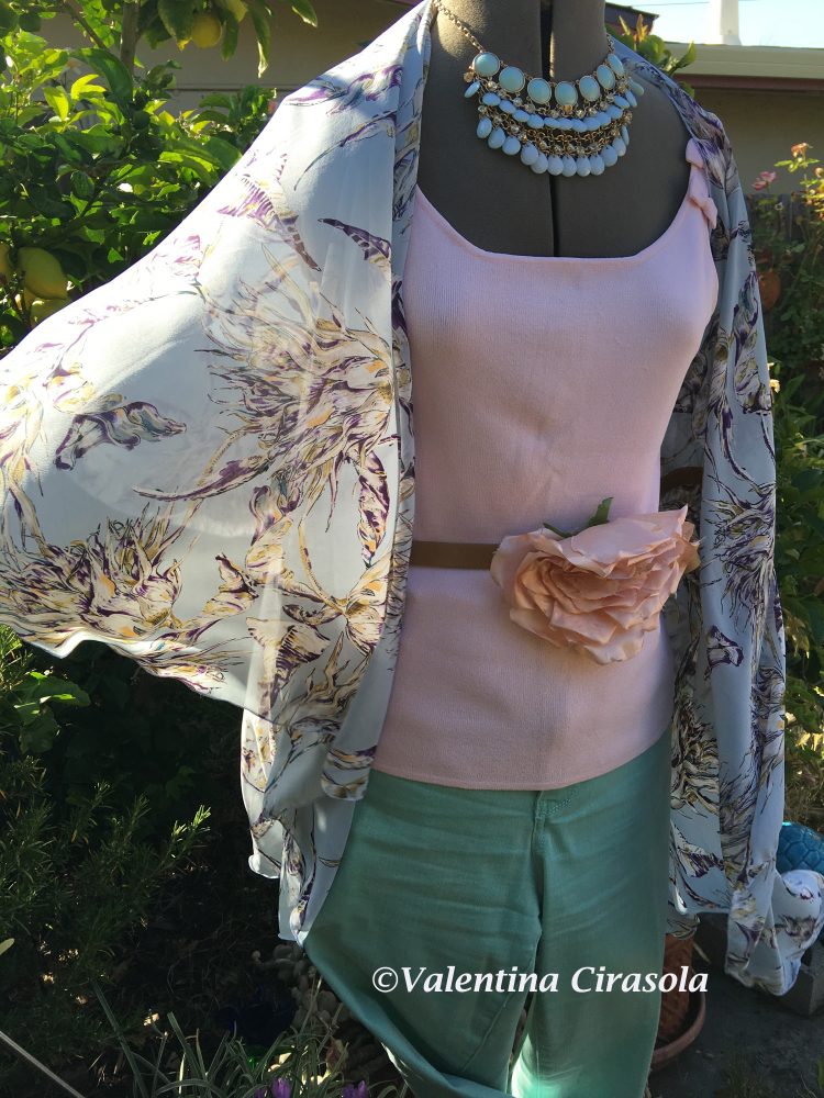 The light colors of 2016 challenge traditional perceptions of color association, which I would have not done in the past. I will try anything and challenge my thoughts before saying: “It’s not for me” and after realizing I might not like it much, at least I will feel cooler in cool colors this spring and summer. The floral capelet is lightweight and versatile, the two layers allow it to wear as a large scarf, as a shoulder wrap. The large flower in the waist turns into a belt and a necklace, as necessity occurs. The sweet flower bag is new, just arrived and matches well with the new color scheme.