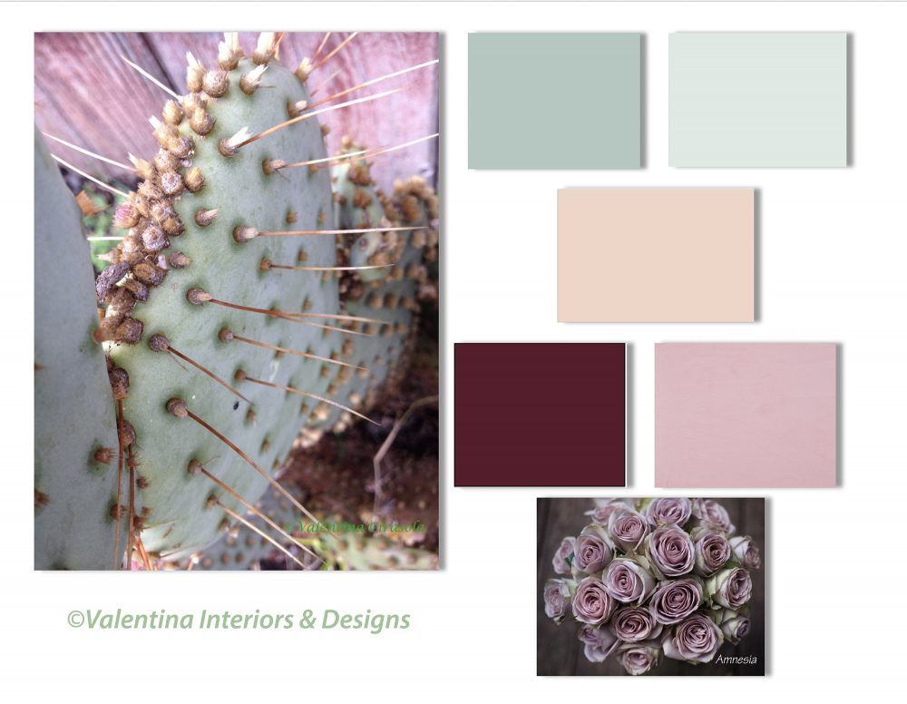 Since this is a feminine color palette, the décor of the room should include some lilac Amnesia Roses, rosy sheer window treatment and a couple natural stones: