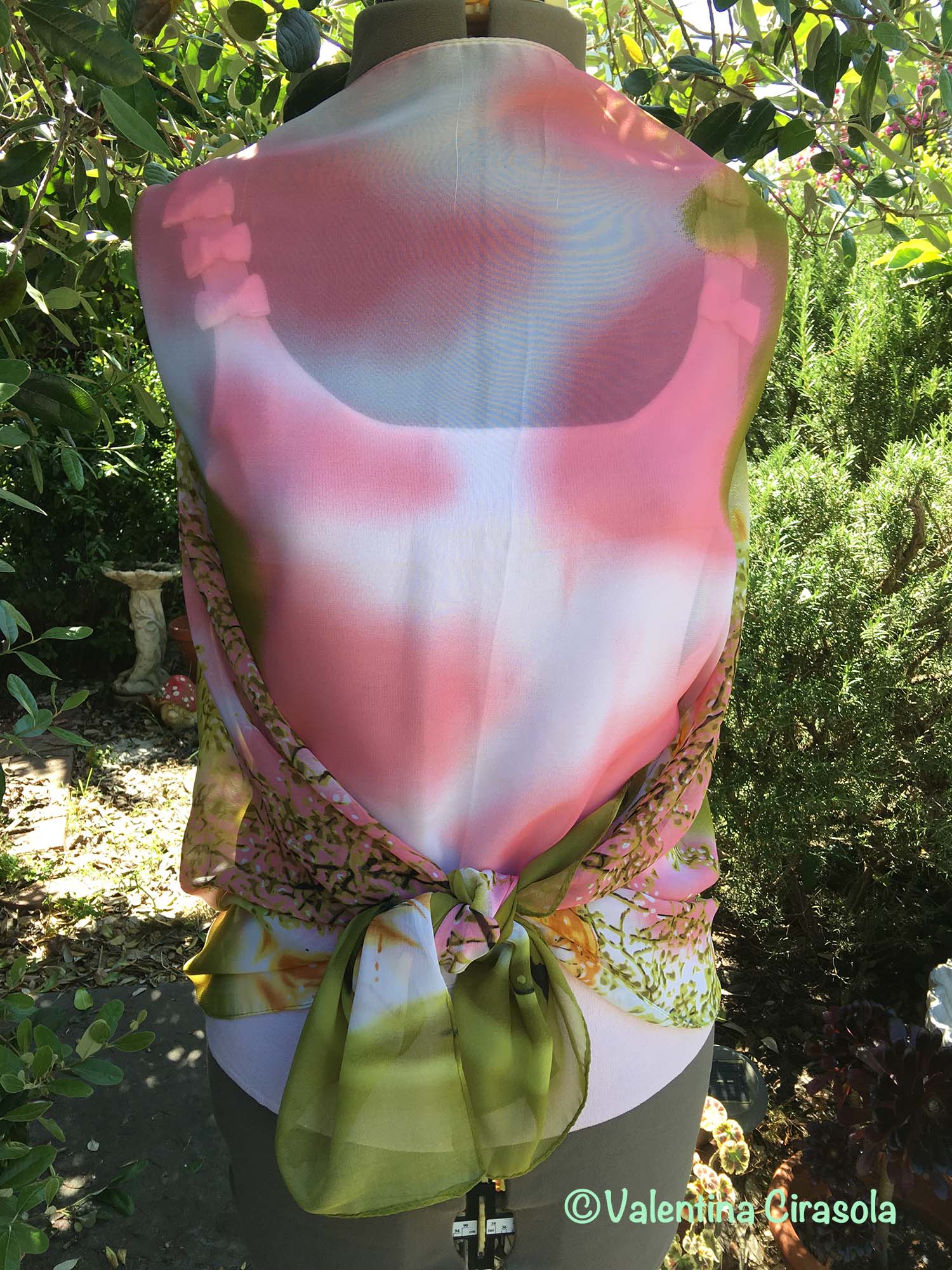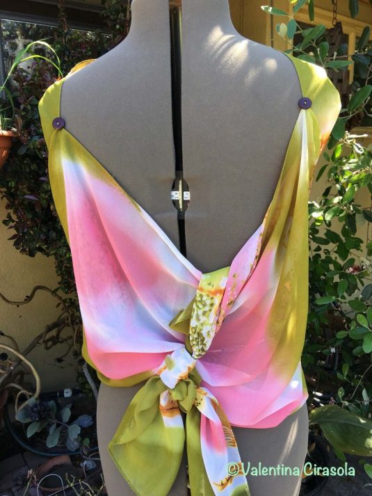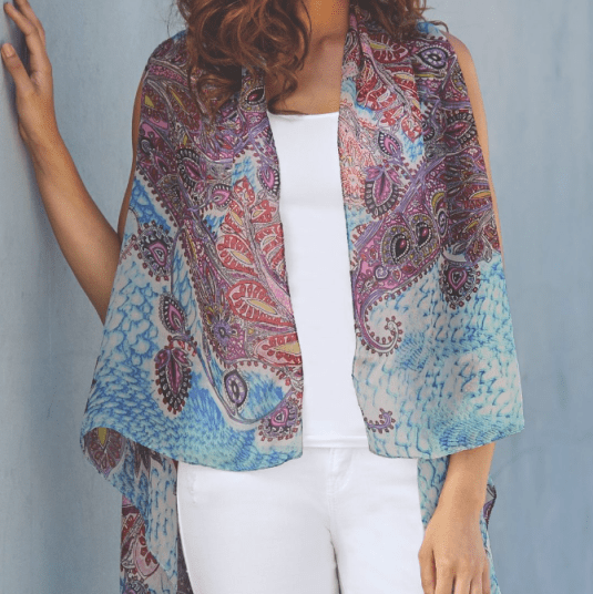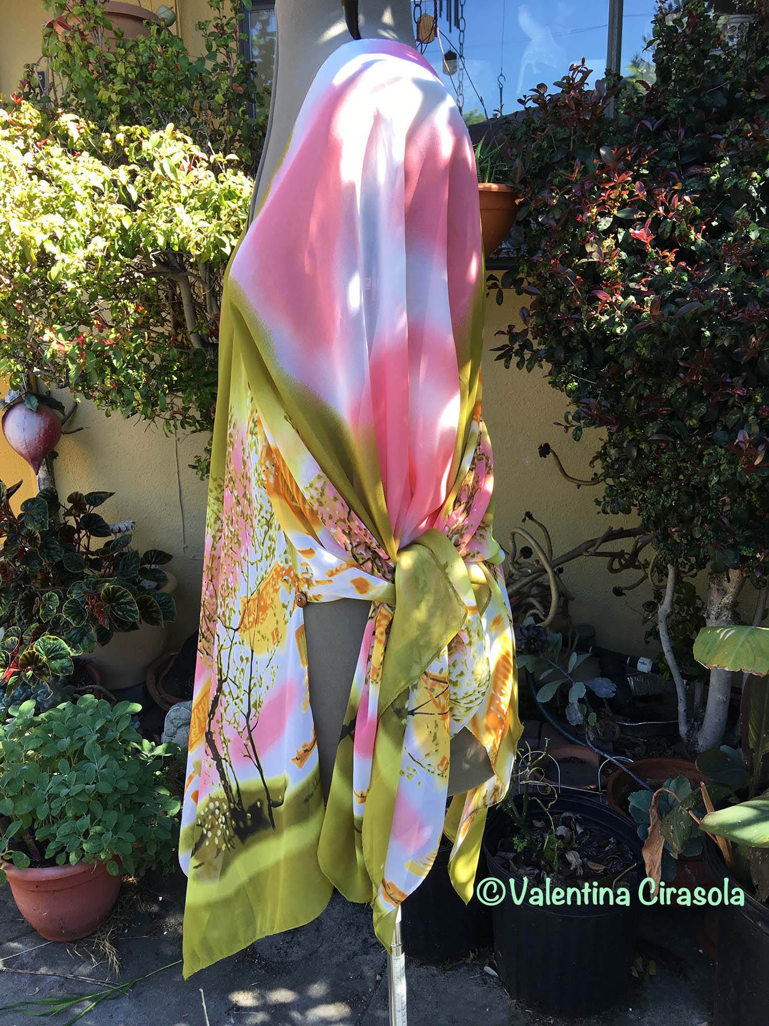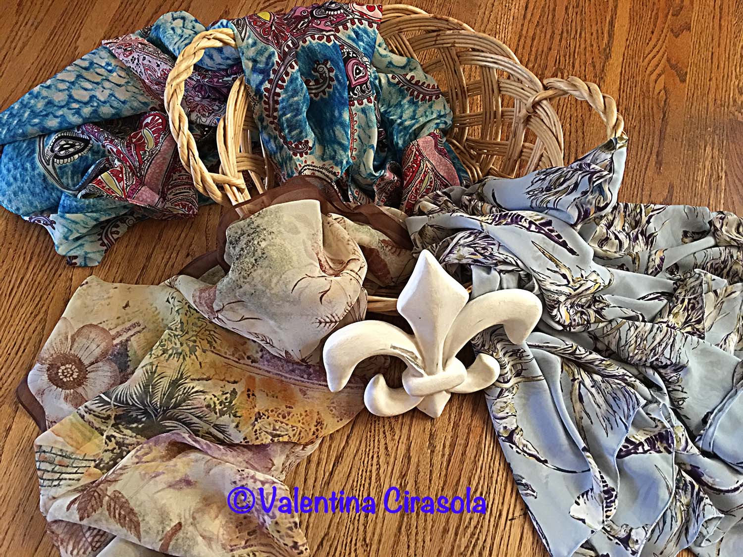 I purchased a variety of convertible scarves with arm holes, which become ponchos, regular scarves, shoulder wraps and bikini covers. I can wear them in many ways as shown in my photos, loose, tied in the front , tied behind and even as short dresses.