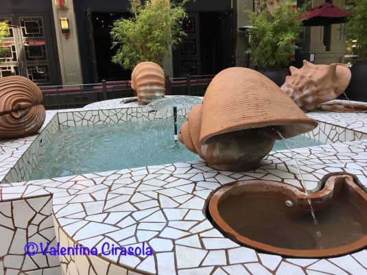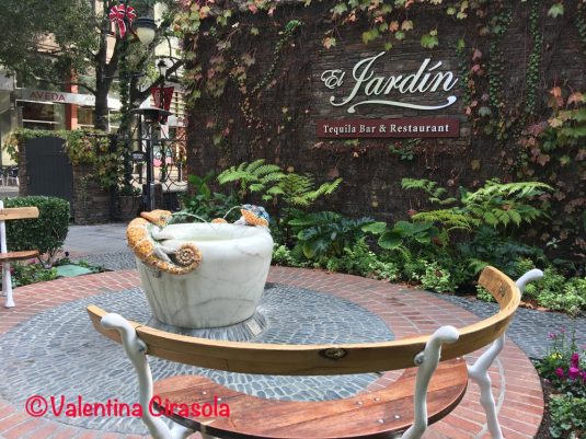 This is Santana Row, South of San Francisco, designed as a European fashionable street with shopping-dining at the street, expensive lofts and apartments up above. It has been designed with nature in mind, that’s the reason of so much lush vegetation and symbols of nature.