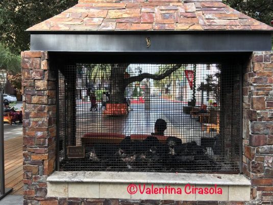 Not too far from there, if one needs to breathe some fresh air after the wines, can take a seat in the unusual street living room fitted with a real functioning fireplace. In the winter days, when it doesn’t rain, sitting there soaking the feeble sun rays is cozy and warm.