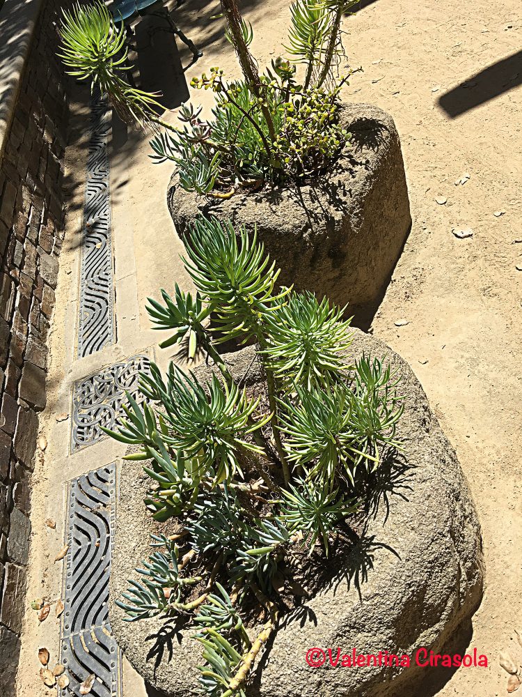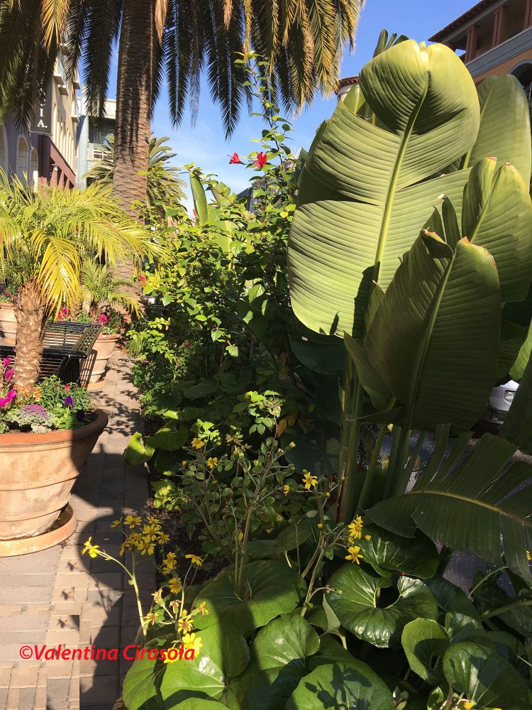 This is Santana Row, South of San Francisco, designed as a European fashionable street with shopping-dining at the street, expensive lofts and apartments up above. It has been designed with nature in mind, that’s the reason of so much lush vegetation and symbols of nature.