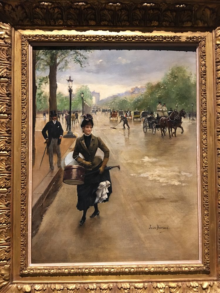 My mom, in her life as a fashion designer/tailor, often used a Modiste (stylist) for her client’s special requests and employed a Trottin (errand girl) the same as the girl on the Champs Élysée painted by Jean Béraud (below). The woman in the painting is as flirtatious as Carlina, the errand girl working in my mom’s tailor shop. Carlina took that time to run errands as her own playful time to flirt and act coquettish with the guys. Often, she returned to the shop out of tune, with her head in the clouds. My mom used to say she had taken too much sun on her head while she was out. Blessed youth!