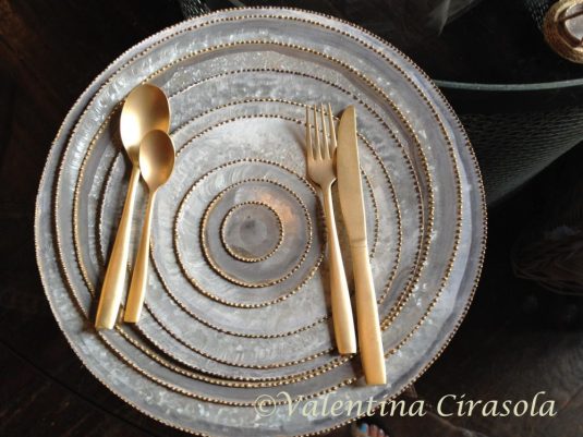 In the same store, I found this very unusual table set made of hammered metal with golden beading. I wondered if this is only a decorative table set, or it is intended for food and if it is, how food would taste on metal. In the Middle Age, metal and wood were the only materials used to make plates, until ceramic was invented.