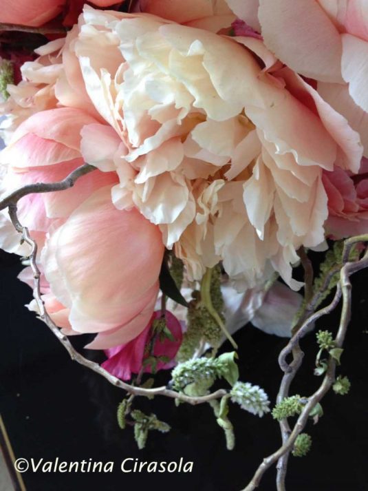 As for the flower creations, keep it natural, don’t use flowers with strong scents, some people have allergy to flowers, keep a relaxed feel, be in tune with the gentle nature of May flowers. Some peonies are not fragrant, just look very beautiful and plump, mix them with silver birch stems with foliage and royal fern. I learned that’s what the British will do for a coming wedding.
