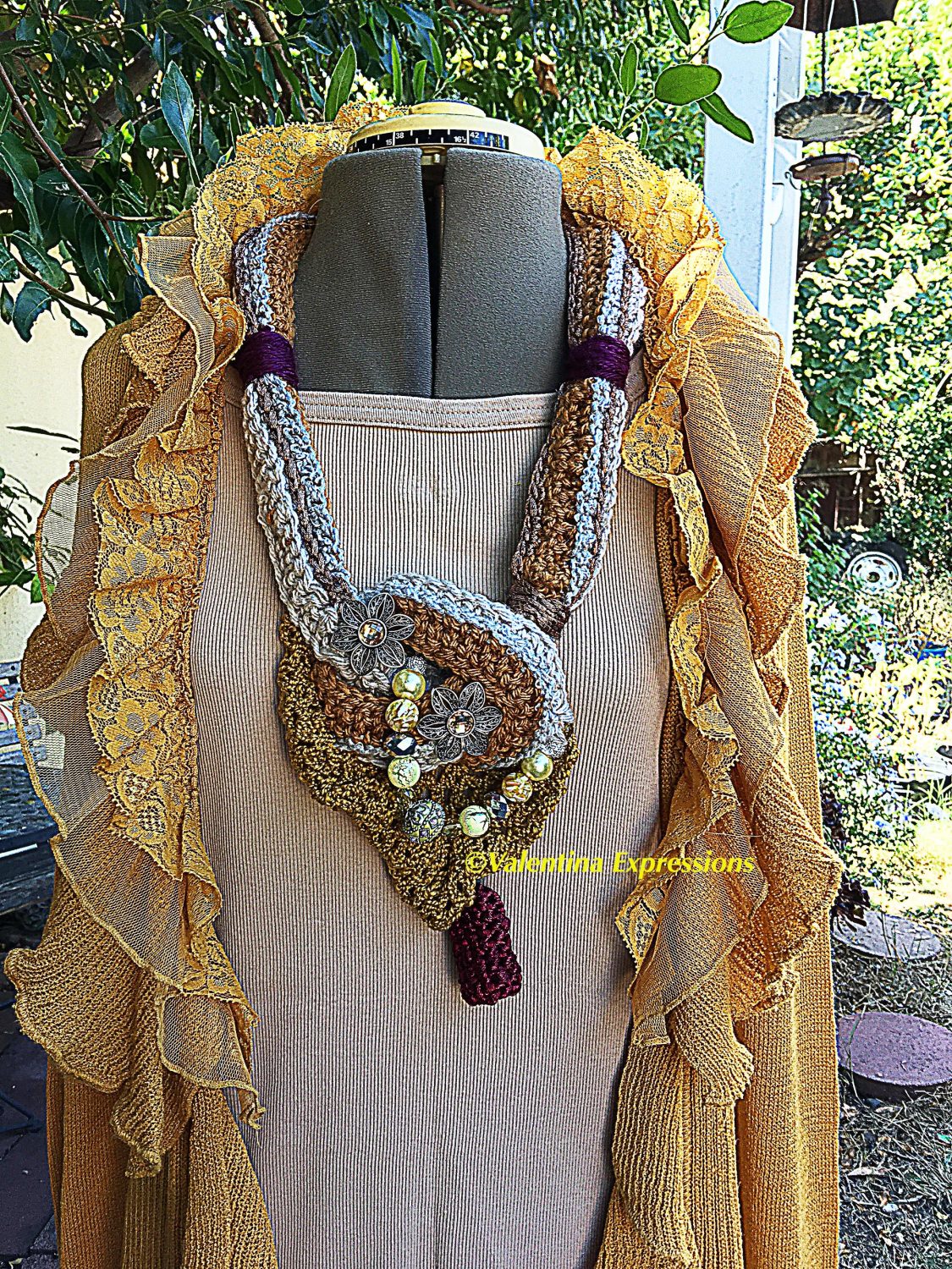 In my creations with yarn, fabrics, beads, glass and various embellishments my neckwarmers look like jeweled colliers and have two functions: keep the neck warm and embellish the clothes.