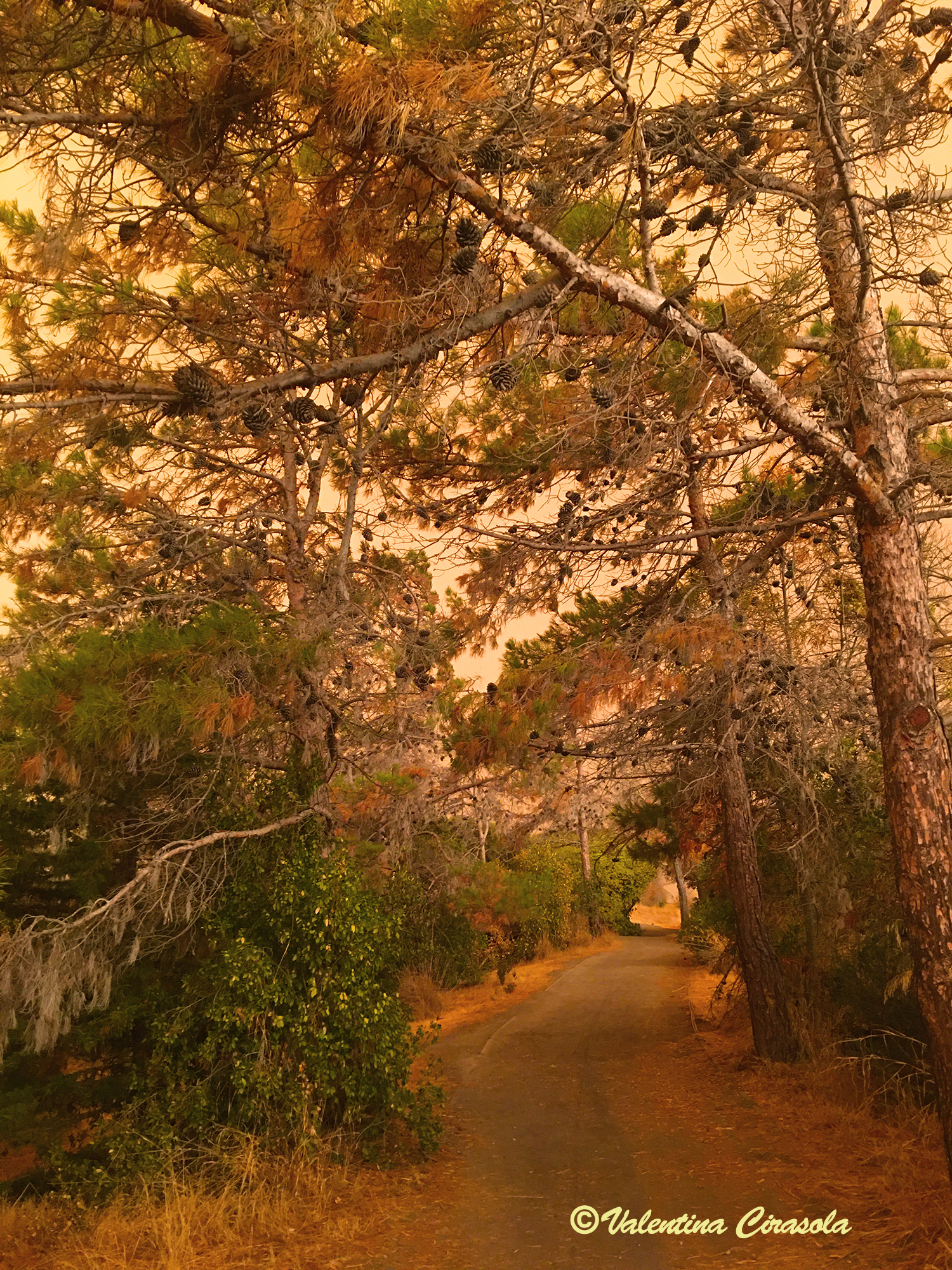 I woke as usual at 6:00 am, actually, a strange yellowish-greyish light in my bedroom woke me up, I thought the lights were left on somewhere in the house during the night, or some UFO had landed. The yellowish light came from outside, the garden was infused with darkness I have never known before, like a noir film. It wasn’t the usual spunky daylight of a day just starting at 6:00 am, and neither was the light of a falling day. It was just dark, grey, and flat, like a winter day, but it felt oppressive as if something was about to happen. As the day progressed, the sky became more yellow and surreal. My flowers have lost their colors, my lemons don’t look yellow, the birds are sensing something is going on and are not singing. I thought this is the way it would be if the sun leaves this earth. No, wait, it would be totally dark. My 5+ mile walk in the park by a lake was full of questions of the day, what if this, and what if that? I was in a total silent nature almost the whole time I was walking. A hand full of people were walking, biking, or exercising, they all had their heads down carrying who knows what kind of weight. It was a strange feeling.