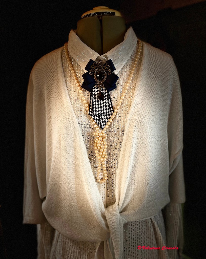 First of all, my white will have sparkles for day or evening wear. Then, I will use a in B & W or color cravat, together with pearls.