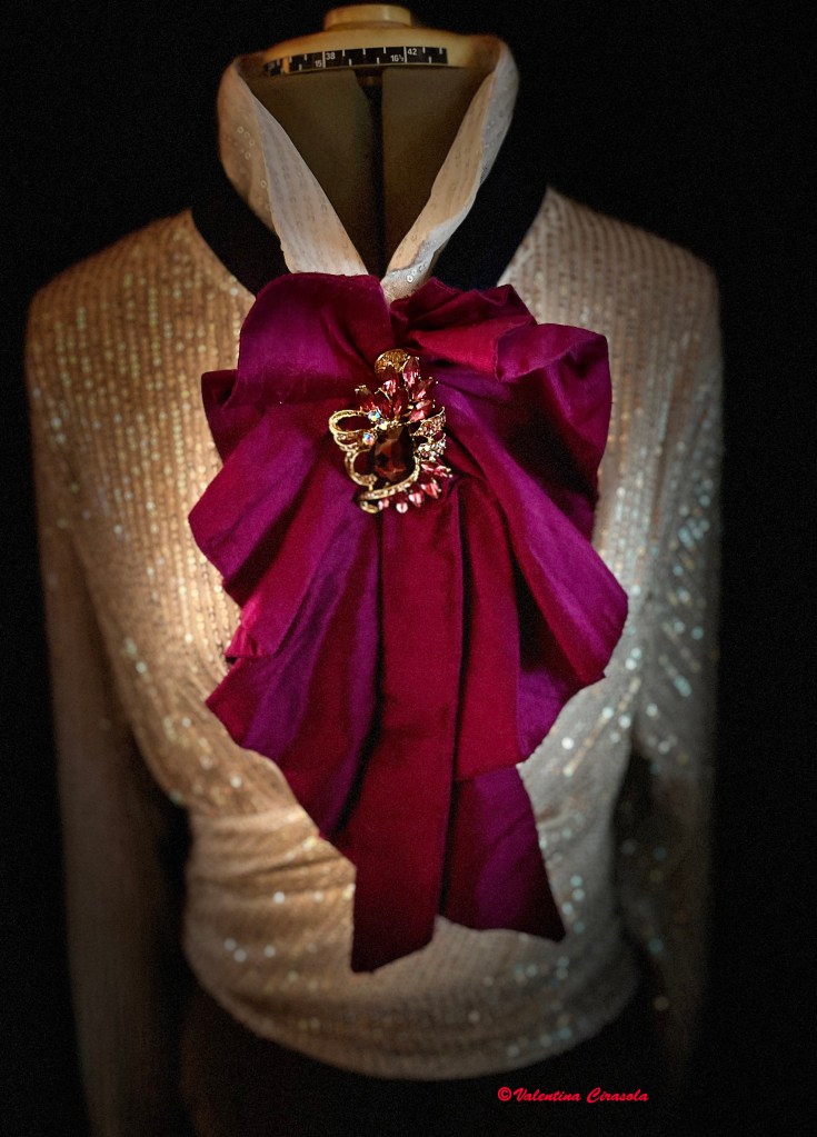 My second choice will be a colorful chabot with a huge brooch (below). Men wore the chabot on their shirts in the 1800s and it is now part of women’s wardrobe.