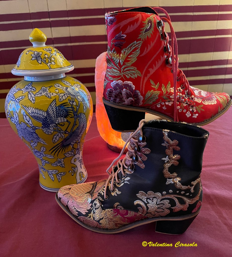 Lately, these colorful brocade ankle boots have sparked my fancy. They lace up in the front through antique hooks. They look like what the French Can Can dancers wore in the 1800th. I bought three pairs. The unfinished wood heels bothered me, the only detail that made these shoes look low-class. My artistic sense told me I needed to paint the heels black. So, I did, I painted them with an acrylic waterproof pen and a coat of varnish. I loved the result, and anyway, these are not shoes for a rainy day.