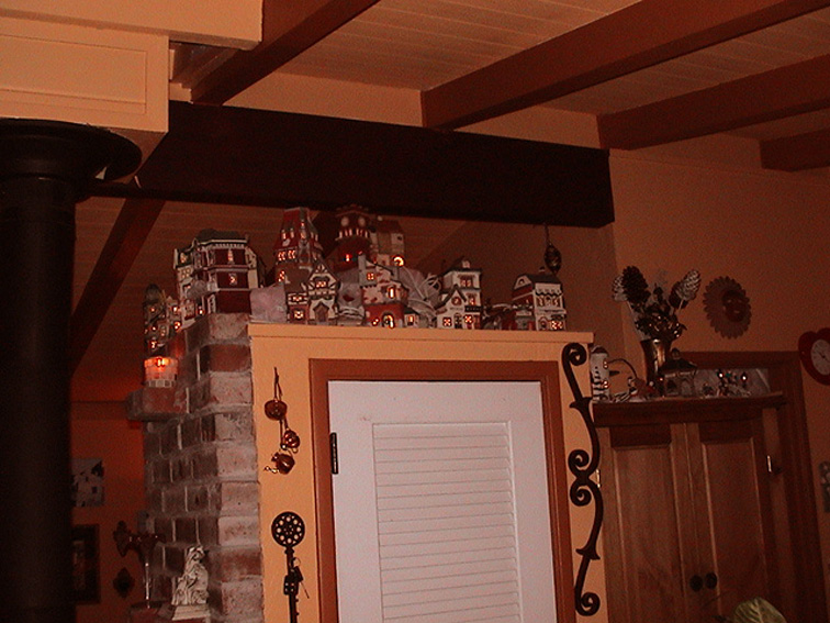 In a separate area of the room, away from the village display, I don’t miss to set up a spirituality corner with my little manger made in Germany by wood workers artists who are still designing small items all by hands and some angels made of Venetian glass made in Murano. LED light strings and candles everywhere illuminate the rest of the house.