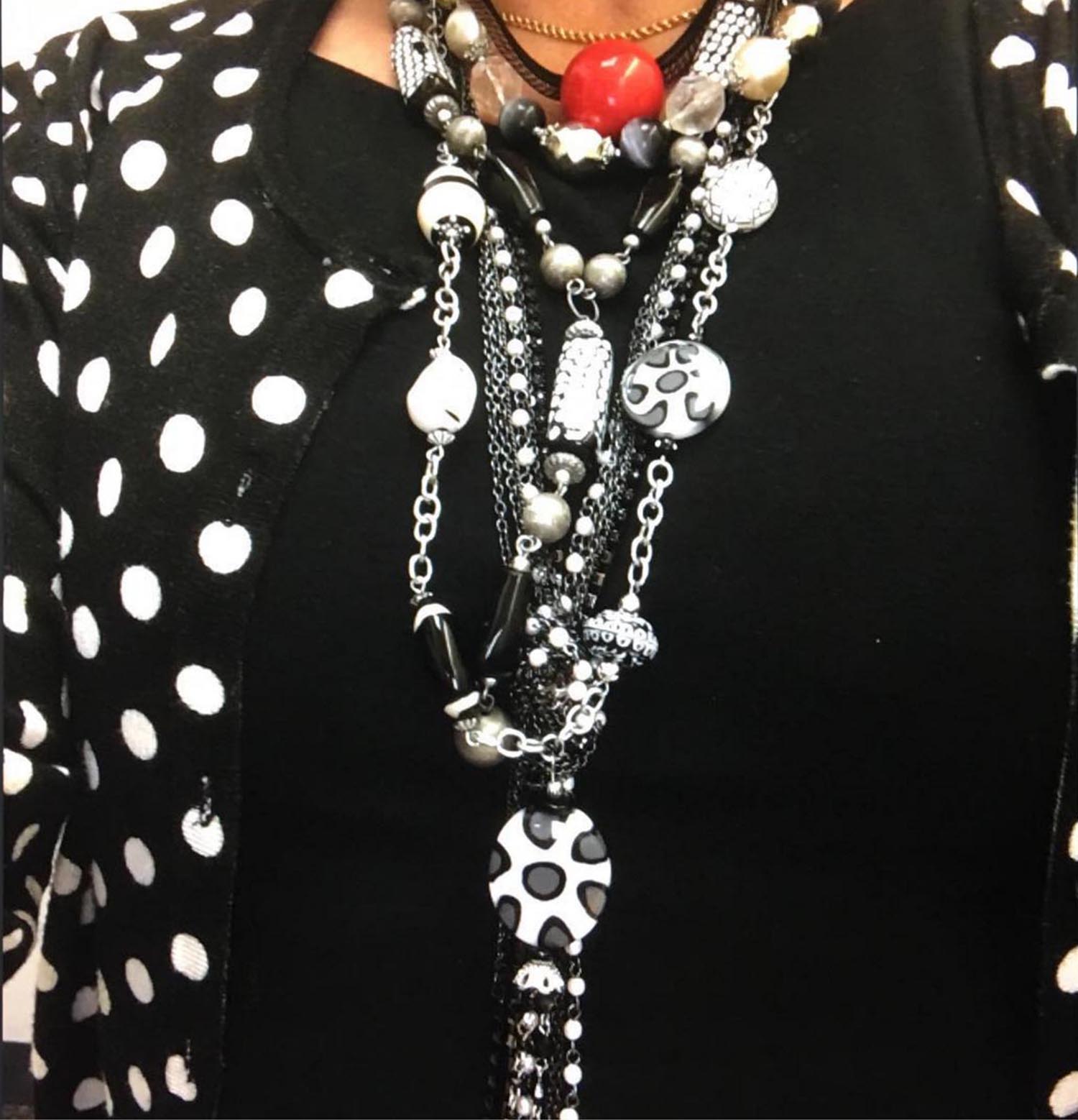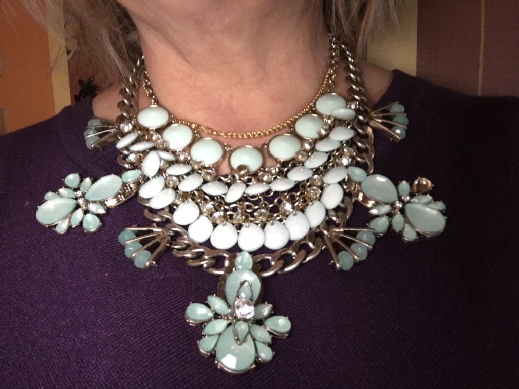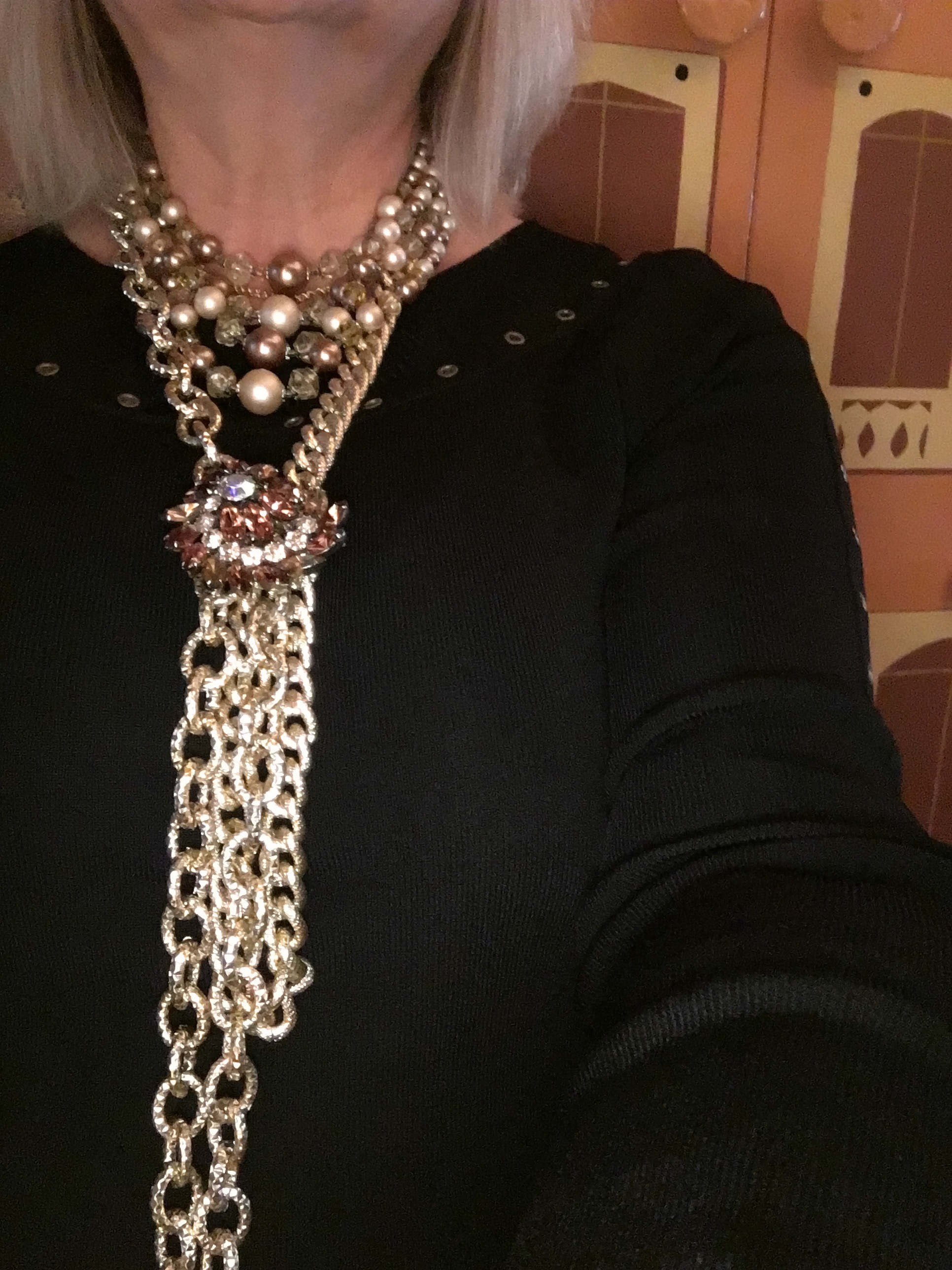 I wore it over a black top and went out strolling in one of the upscale towns in my area. I strolled up and down the street. I looked at store windows. I sat at a cafe to pause and show off the piece I was wearing. Then I continued strolling up and down. I received a few curious comments, but nothing told me I was wearing a hit piece. I was ready to leave, almost disappointed that people didn’t react as I expected.