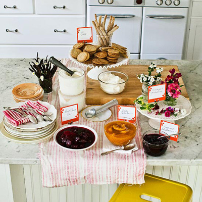 Designate areas for toppings, fruits, garnishes, cones, all the ingredients for making various type of ice cream; then designate a different area for all utensils and one more area for all the drinks. This way, the traffic will flow harmoniously and your guests will not be on top of each other preparing their own ice cream.
