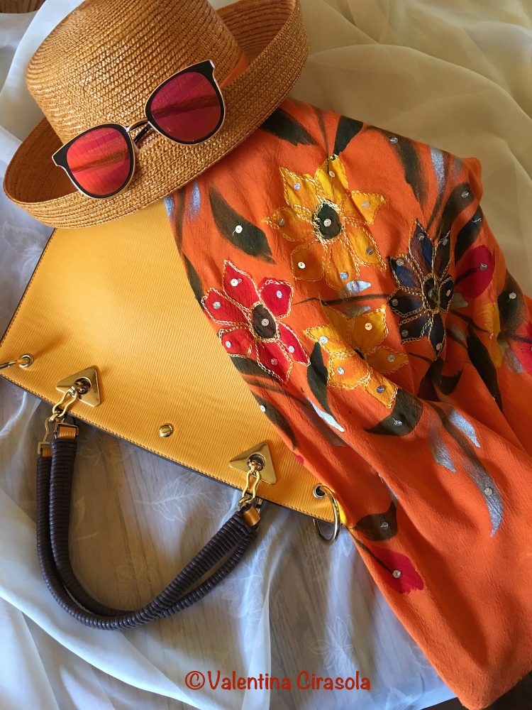 Hand embroidered and hand painted tunic, with a salmon orange hat and a papaya bag. It looks so fantastic when I wear it all together.