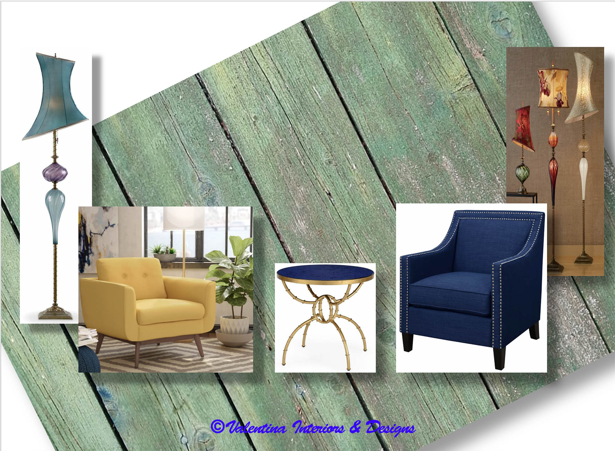In the living room, I selected blue and yellow chairs, a blue top side table, green plants, colorful lamps in all shapes, sizes, and designs, nothing matching.
