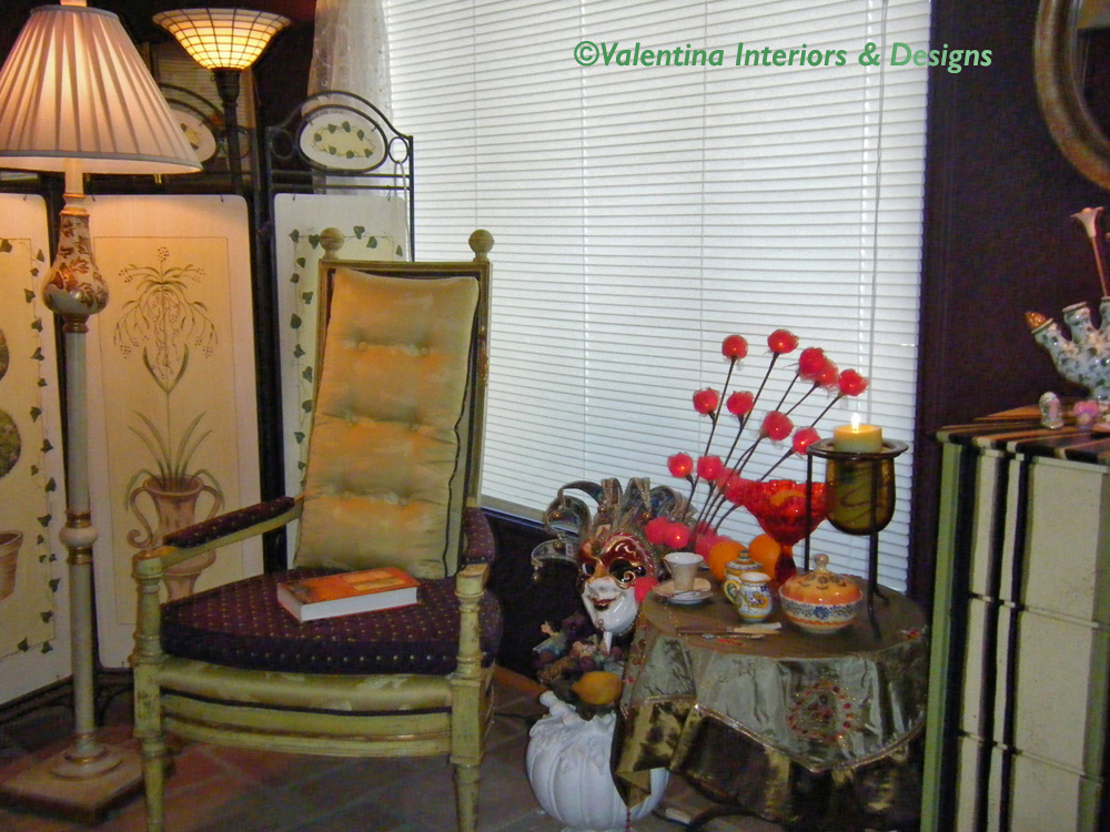 To find a Venetian chair was a challenge, but not for long. I found a chair with the right shape and price, but beauty wasn’t there. A skillful painter, using only Chartreuse and gold paint, turned the chair into a Venetian style. Re-upholstered with a double face fabric: Chartreuse color fabric with Venetian shoes printed on, paired with a purple-chartreuse polka dots fabric, made this chair an original, whimsical Venetian idea. It is now in my reading, breakfast corner.