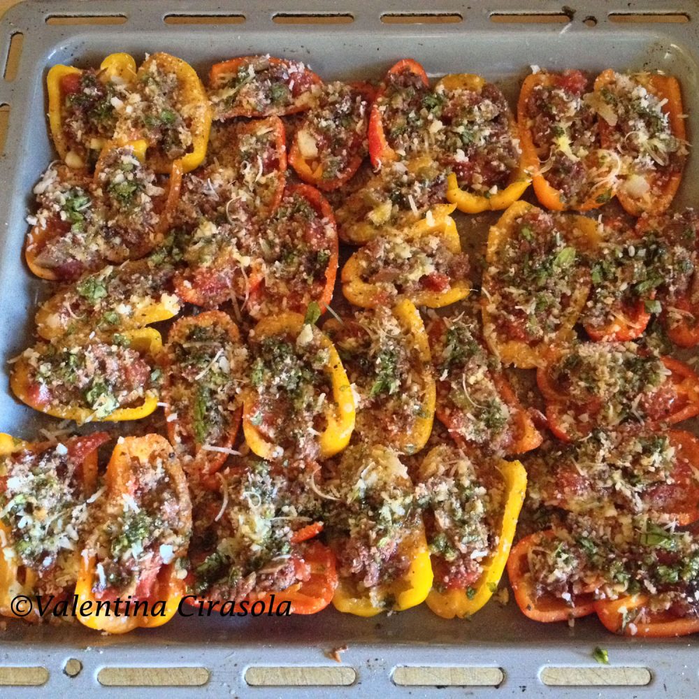 Mini peppers stuffed open face with saffron rice, spinach, beaten eggs, breadcrumbs, spices, olive oil, salt & pepper.